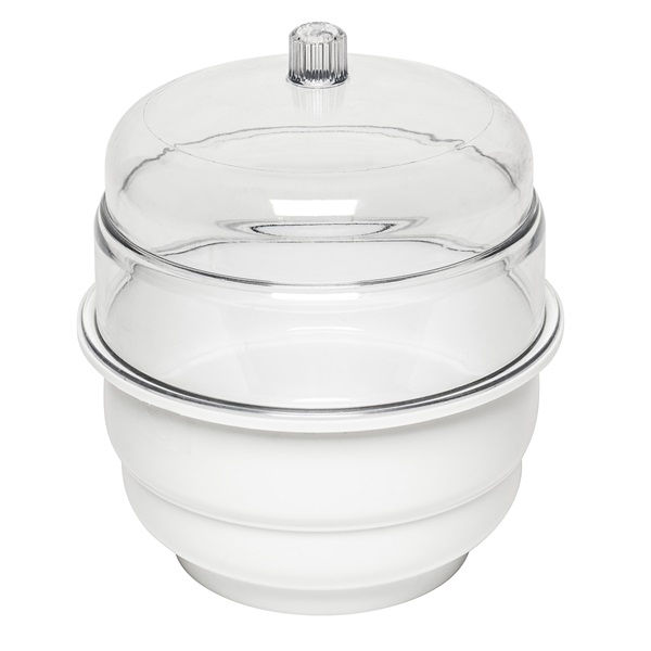 Desiccator, 0.31 cu ft, 24 ID x 31.1 cm H, White Polypropylene Bottom, Clear Polycarbonate Top, 23 cm dia Plate Diameter, 0.32 cm Thickness Plate, 27.3 cm Flange OD, 19.7 cm Clearance Above Plate, Strong, Shatterproof