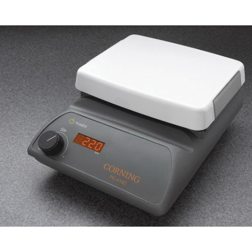 The Corning PC-410D stirrer has a 5 (12.7 x 17.8 cm) Pyroceram® top and digital stirring speed display. It is designed to operate on 230 V/50 Hz with CEE7-7 plug for use in parts of Asia, Africa, Australia and other areas with similar electrical requirements.