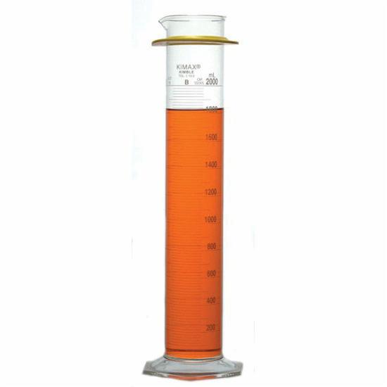 Cylinder, 2000 ml, 520 mm H, Borosilicate Glass, 100 to 2000 ml Graduation Range, 20 ml Graduation Intervals, ±10.0 ml Tolerance, With Spout, Calibrated To Contain, Class B, Provided with a Hexagonal Base Flat Ground for Stability