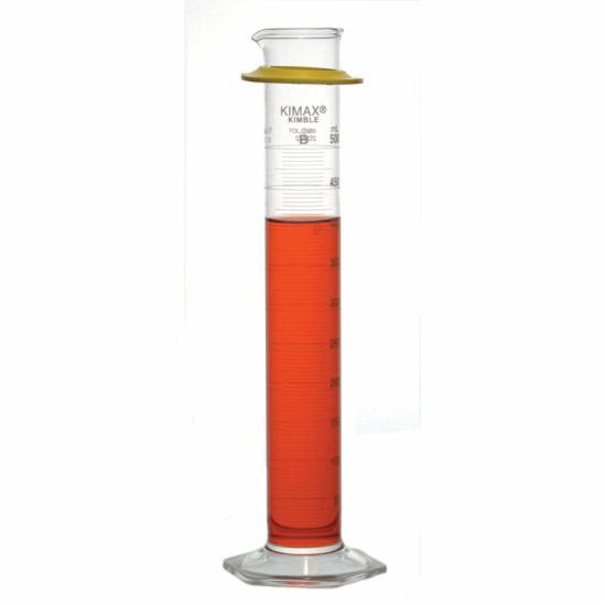 Cylinder, 500 ml, 375 mm H, Borosilicate Glass, 25 to 500 ml Graduation Range, 5 ml Graduation Intervals, ±2.6 ml Tolerance, With Spout, Calibrated To Contain, Class B, Provided with a Hexagonal Base Flat Ground for Stability