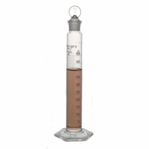 Mixing Cylinder, 500 ml, 380 mm H, Borosilicate Glass, 25 to 1000 ml Graduation Range, 5 ml Graduation Intervals, ±1.10 ml Tolerance, 9 Standard Taper Stopper, Calibrated "To Contain", Class A, White Ceramic Enamel, Serialized and Certified