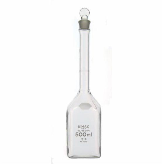 Square Volumetric Flask, 500 ml, 320 mm H, Borosilicate Glass, ±0.2 ml Tolerance, Number 19 Standard Taper Stopper, Class A, Calibrated To Deliver, With Marking Spot, Graduation Ring Blasted On the Neck