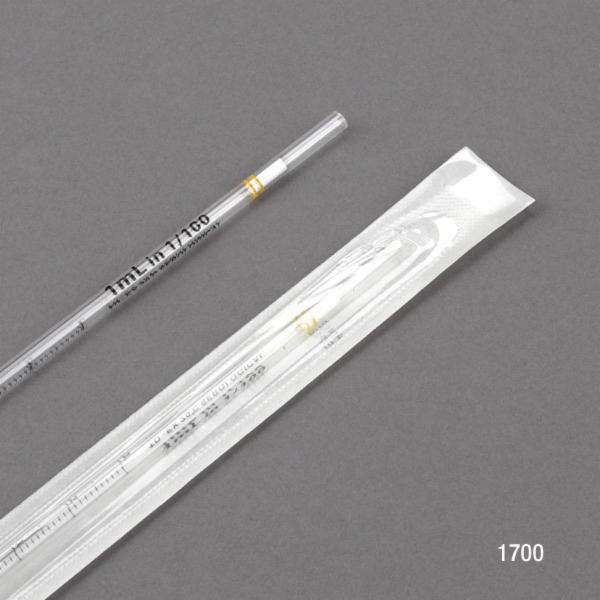 Serological Pipette, 1 ml, 275 mm L, Polystyrene, 0.01 ml Graduation, ±2% Accuracy, Standard Tip, Hydrophilic PET Plug, Yellow Striped, Sterile, Calibrated to Deliver, Individually Wrapped, Non-cytotoxic, Pyrogen-free