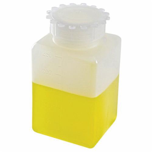Bottle, 250 ml, 110 H x 60 W x 57 mm D, 34.5 mm ID, Clear, HDPE, Square, Wide Mouth, 50 ml Graduations, 110°C Temperature, Polypropylene Screw Closure, Polyethylene Liner, For Long Term Storage of Samples, Suitable for Foodstuff