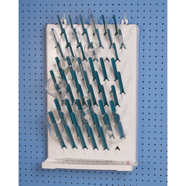• Small (3"), medium (4") and large (5") pegs can be moved and repositioned to hold a variety of labware including beakers, flasks, bottles, test tubes and cylinders