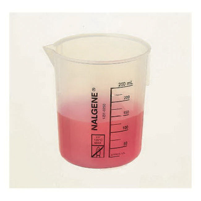 Griffin Beaker, 250 ml, 7.9 dia x 9.2 cm H, Polypropylene, 25 ml Graduation Intervals, Low-Form, Ribs For Easy Stacking, Silk-Screened With Graduations, Size Code, Resin Code, Catalog Number, For Easy Identification And Safe Use