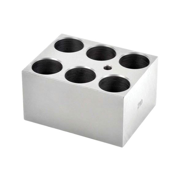 Standard Test Tube Block, 9.5 L x 7.6 W x 5.1 cm H, Anodized Aluminum, 6 Wells, 25 mm Sample, 26.2 dia x 48.4 mm D Well, Thermometer Well, Close Contact of Tubes-to-Walls Allowing For Maximum Heat Retention, Single Block