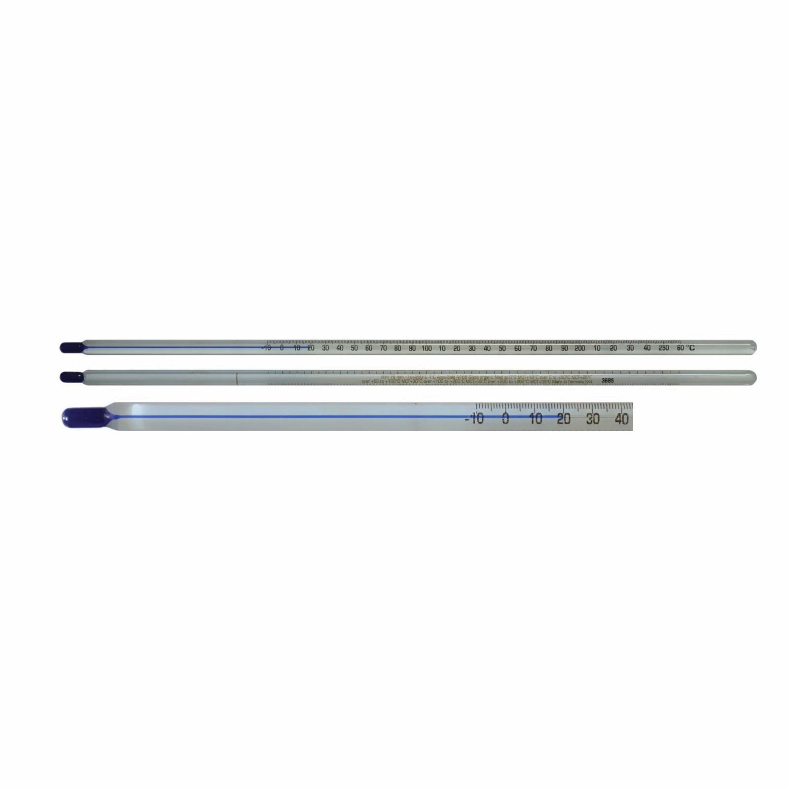 Thermco's Accu-safe Non-toxic thermometers are filled with a biodegradable organic liquid and dye, which eliminates the hazards of mercury in the case of breakage and/or disposal. The safety-coated thermometers protect against breakage and contain the liquid and glass inside the coating for safety and easy disposal. A Certificate of Accuracy is included with each thermometer. Each thermometer is serialized and has blue liquid against a white background for ease of reading.