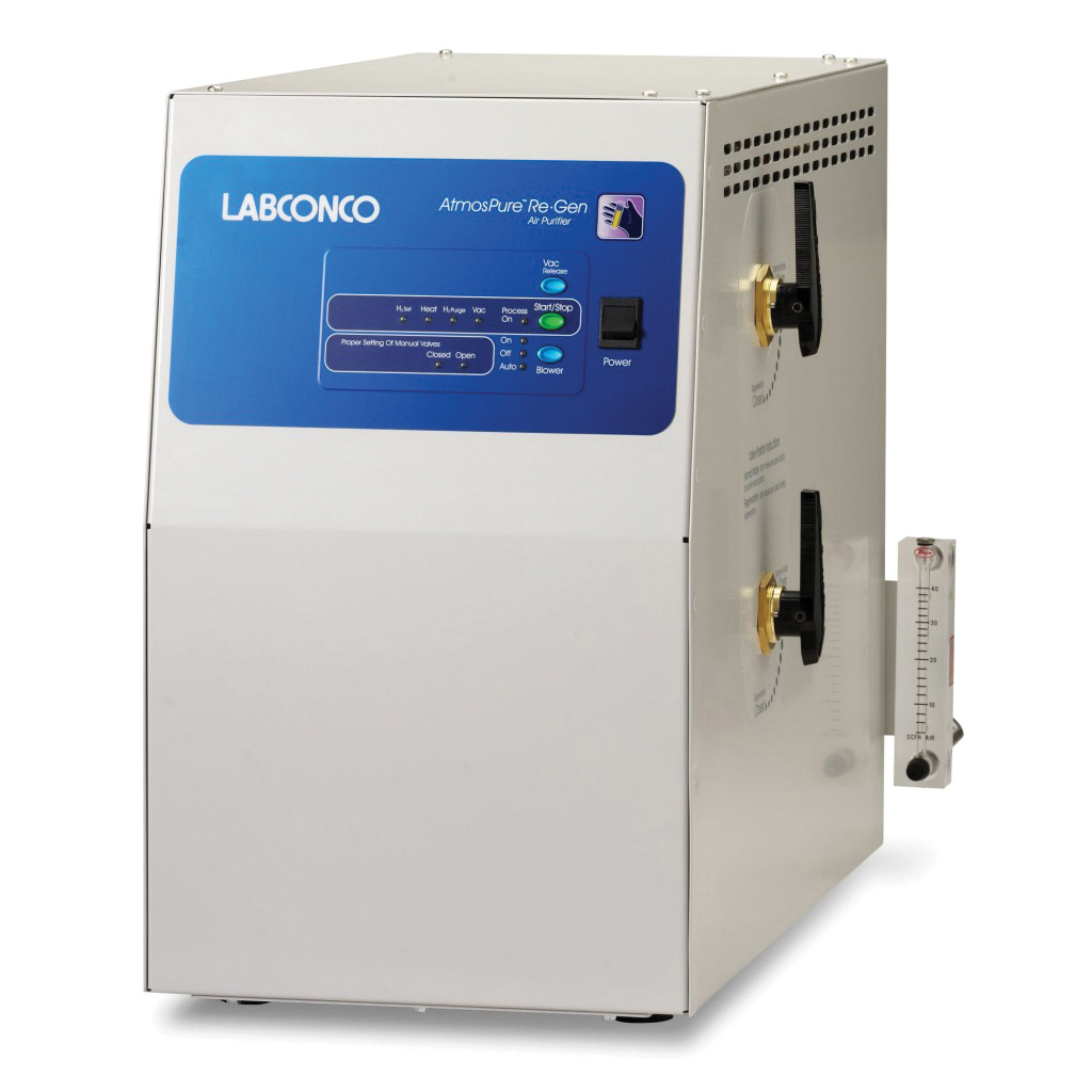 The AtmosPure™ Re-gen gas purifier produces an ultrapure inert atmosphere for materials sensitive to moisture and/or oxygen by circulating an inert gas and removing oxygen and moisture inside the box. Compatible with any Protector® or Precise® controlled atmosphere glove box, the AtmosPure™ allows these glove boxes to meet or exceed ISO 10648-2 test methods. The purifier has the capacity to remove up to five liters of oxygen (13.5 ppm) and 660 g of moisture (18 million ppm) at standard temperature and pressure (STP). Depending on the application, glove box liner material and frequency of use, regeneration may be necessary only once every one to three months and completed in only 13 hr