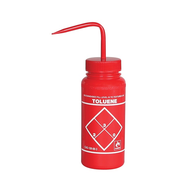 Wash Bottle, 500 ml, Red, LDPE, Red Cap, Polypropylene Cap Material, Wide Mouth, 53 mm Neck Size, Toluene Labeled, Safety-labeled, Easy-to-read Printed Bottles, Solvent-resistant, Easy Refilling