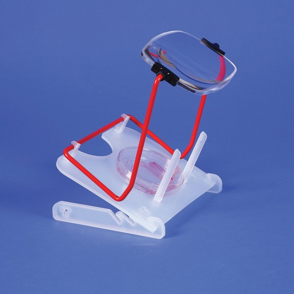 This free-standing magnifier allows enhanced viewing of Petri dishes, multi-well plates, x-ray films, stained gels, slides or text with a precision molded lens offering 1.75 magnification. The unique stand with an adjustable angle magnifier can be placed over a variety of objects including the Mini Light Box.