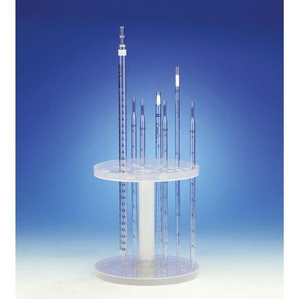 Polypropylene plastic stand has a two-section top plate; one with 10 holes, 14 mm in diameter, the other with 18 holes, 11 mm in diameter. Holes in the lower plate are 4 mm in diameter and support the tips of the pipettes as they are held in the stand.