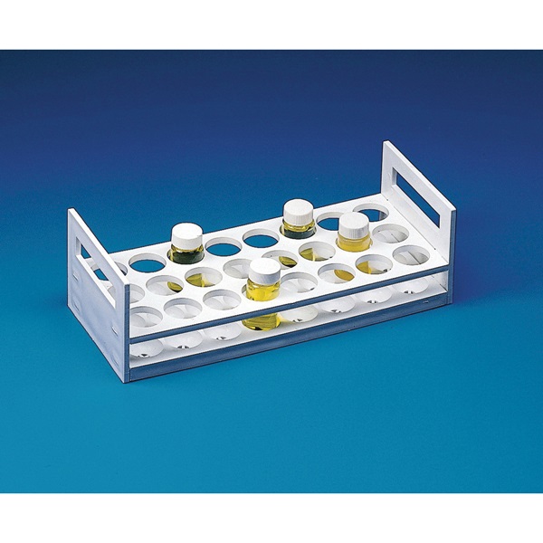 Scintillation Vial Rack, 29.8 L x 12.7 W x 9.5 cm H, Polypropylene, 30 mm dia, 24 Places, For 25 to 30 mm Vials, 4.4 cm Shelf Height, Corrosion-resistant, Autoclavable, For Convenient Storage, Handling, and Sample Preparation