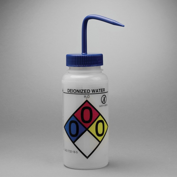 Wash Bottle, 500 ml, Translucent, LDPE, Blue Cap, Polypropylene Cap Material, Wide Mouth, 53 mm Cap Size, Deionized Water Labeled, Pre-printed, Safety-vented, Color-coded, Valve Allows Dispensing of Wash Bottle in an Upright or Inverted Position