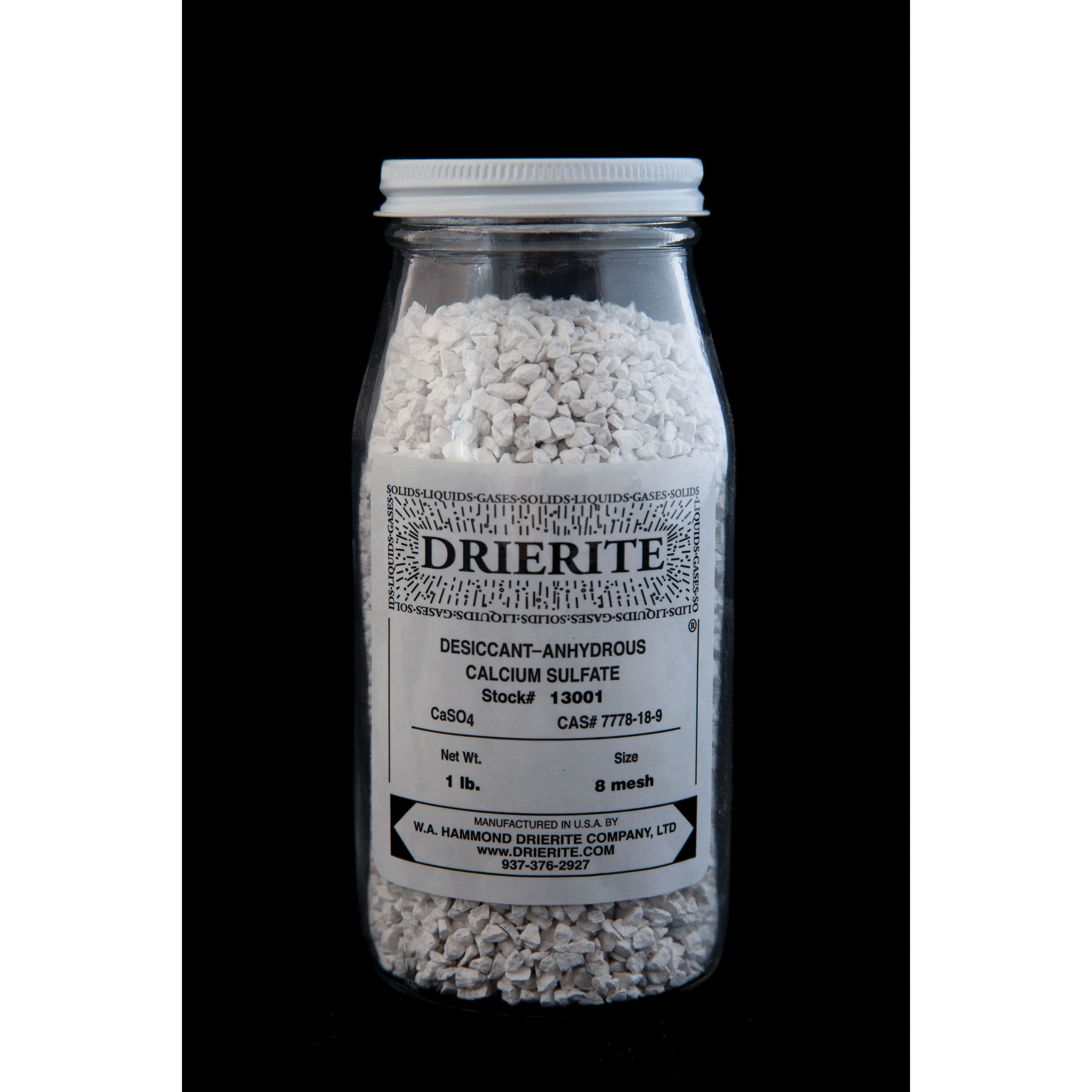 Drierite™ desiccants are made from the naturally occurring mineral, gypsum (calcium sulfate), and are available in several varieties designed to solve all types of drying problems. Drierite™ is an all purpose drying agent for the efficient and rapid drying of air, industrial gases, refrigerants, organic liquids and solids. It is used to maintain a dry atmosphere in storage spaces, vaults, commercial packages, and other enclosures; and for the protection of hygroscopic materials or materials subject to mildew, corrosion, rust, or other deterioration caused by high humidity. Regular Drierite™ is anhydrous calcium sulfate. It is of neutral pH, constant in volume, chemically inert except toward water, insoluble in organic liquids and refrigerants, non-disintegrating, non-wetting, non-toxic, non-corrosive, non-channeling, generally recognized as safe (GRAS) by the FDA, not regulated by OSHA, economical to use, and can be regenerated repeatedly for reuse.