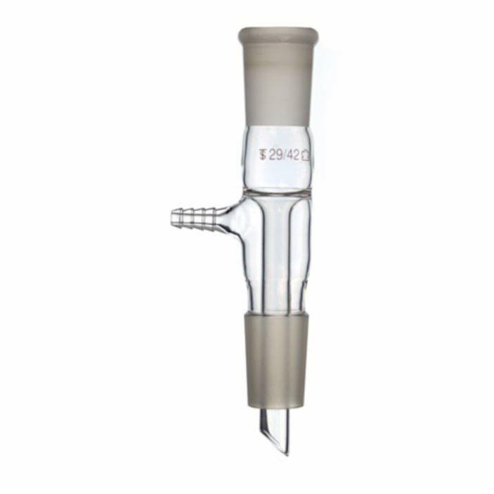 Hose Inlet Adapter, 155 mm H, Borosilicate Glass, 0.37" ID Fits Tubing, 24/40 Standard Taper Joint, Vacuum Take-Off, Drip Tip, Vertical, Outer Standard Taper Joint at the Top, Inner Standard Taper Joint at the Bottom, Class A
