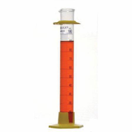 Cylinder, 100 ml, 248 mm H, Borosilicate Glass, 2 to 100 ml Graduation Range, 1 ml Graduation Intervals, Educational Grade, Plastic Base, Calibrated To Deliver, Single Blue Metric Scale, Class B, SAFE-GARD® Bumper