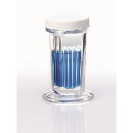 This unit is used for staining slides, or as a developing chamber for thin-layer chromatography. It holds five single 75 x 25 mm slides vertically, or 10 slides back-to-back. The screw cap is made of linerless white polypropylene to reduce solvent evaporation. The unit has a rectangular base and holds approximately 60 ml. Manufactured from soda-lime glass.