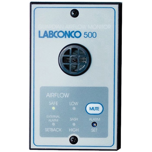 For installation in a factory-prepared cutout on the upper portion of the Basic Hood's right side fixture panel. Guardian 500 Airflow Monitor senses and alerts the operator to low airflow conditions. Includes a face plate with circuit board, electrical power pack, vinyl tubing and airflow tube adapter. From the monitor's face plate, the user can easily select and calibrate a set point between 30 and 250 fpm using a velocity meter and a screwdriver. A green LED glows to indicate "safe" when airflow is greater than the low set point. A red LED flashes to indicate "low when airflow is below the low set point. An amber LED flashes when the sash is raised above the maximum safe working opening height. An audible alarm sounds (and can be muted) when under "low" and "sash high" condition. Includes night setback, external alarm and alarm mute functions.