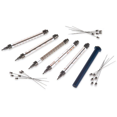 The 800 series syringes are the reinforced plunger version of the 700 series syringes. Attached to the flange of the syringe is a blue syringe holder. The syringe holder provides an area to hold the syringe that prevents heat transfer, dispense inaccuracies, and plunger blow outs. Additionally, it provides support 800 Series Syringes to small volume plungers that are prone to bending during injection. This series of syringes is ideal for dispensing volumes from 0.5 µl up to 250 µl.