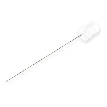 The Kel-F hub is made from CTFE plastic. Needles are available from 31 to 10 gauge. This hub is recommended when connecting to a rigid male Luer like a luer tip (LT) syringe because the plastic is more pliable and creates the best seal. All needles are sold in six-packs and the standard needles are 51 mm long.