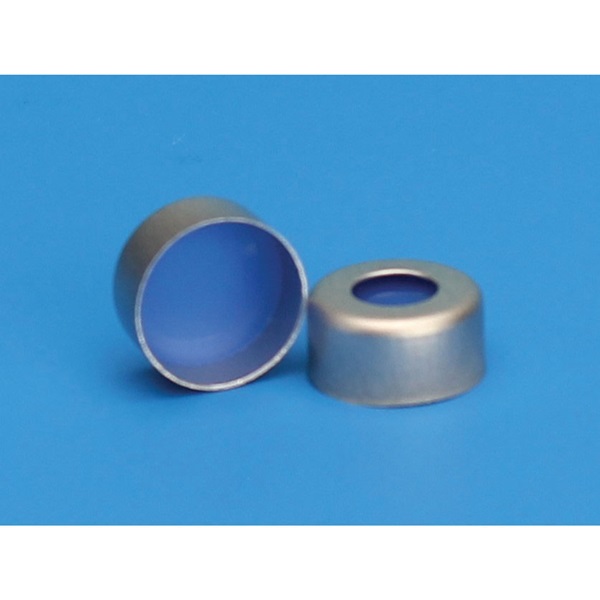 Closure, 11 mm, Silver, Aluminum, 1 mm Thick Ultra Low Bleed Clear PTFE/Blue Silicone, Crimp Top Type, For 12 x 32 mm Standard Opening Crimp Top Vials, For Mass Spectrometry