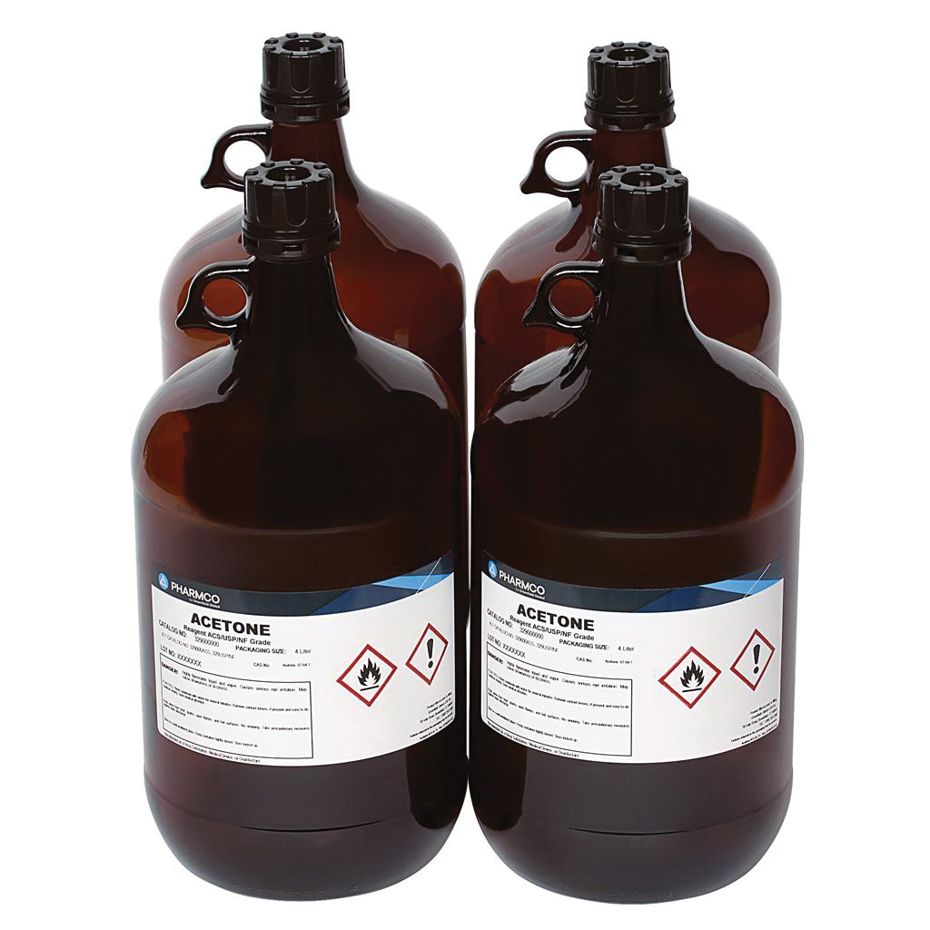 Acetone, 4 L, ACS, USP Grade, CAS Number 67-64-1, C3H6O Chemical Formula, 58.08 g/mol Molecular Weight, Clear, Liquid, -137.2°F Melting Point, 132.8°F Boiling Point, -4 to -0.4°F Flash Point, 0.791 g/cm3 Density