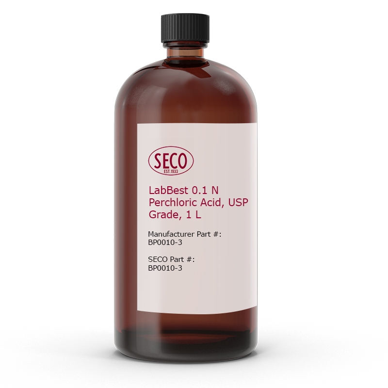 Perchloric Acid, 1 L, 0.1 N in Glacial Acetic Acid, USP Grade, Colorless, Liquid, 118°C Boiling Point, 40°C Flash Point, 0.8 Density, Soluble in Water, Amber Glass Bottle Packaging