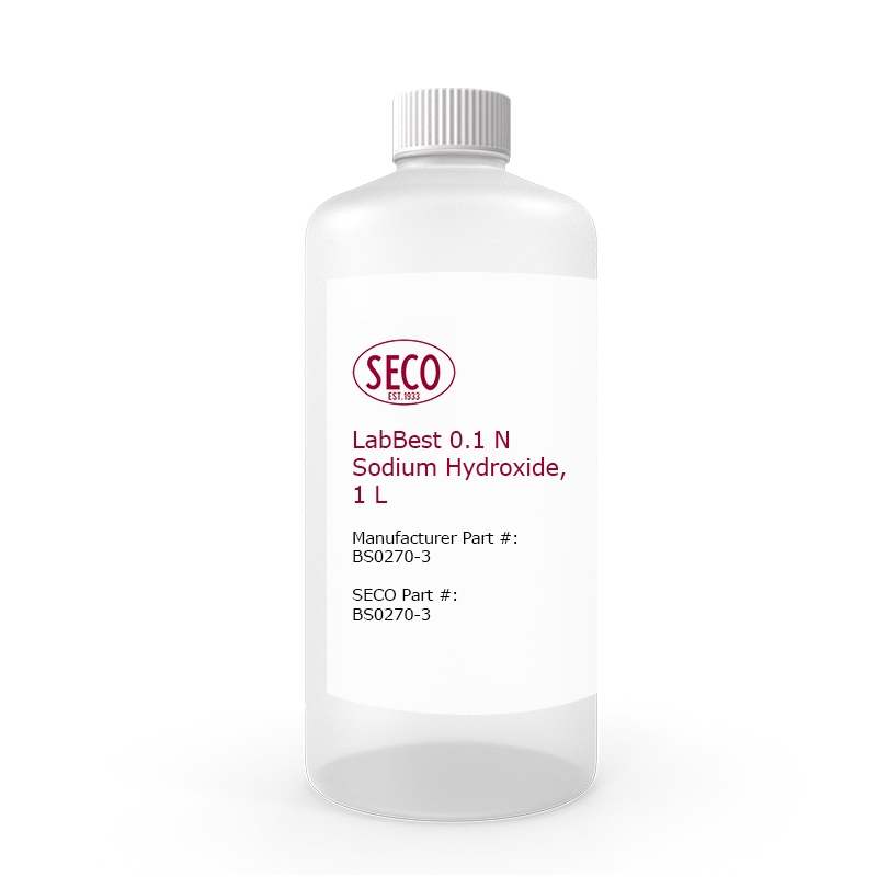 Sodium Hydroxide, 1 L, 0.1 N (N/10) Concentration, CAS Number 1310-73-2, NaOH, 39.99 g/mol Molecular Weight, Colorless, Liquid, 100 to 100°C Boiling Point, 0°C Melting Point, 13 pH, 1 Density, Soluble in Miscible, Poly Natural Packaging