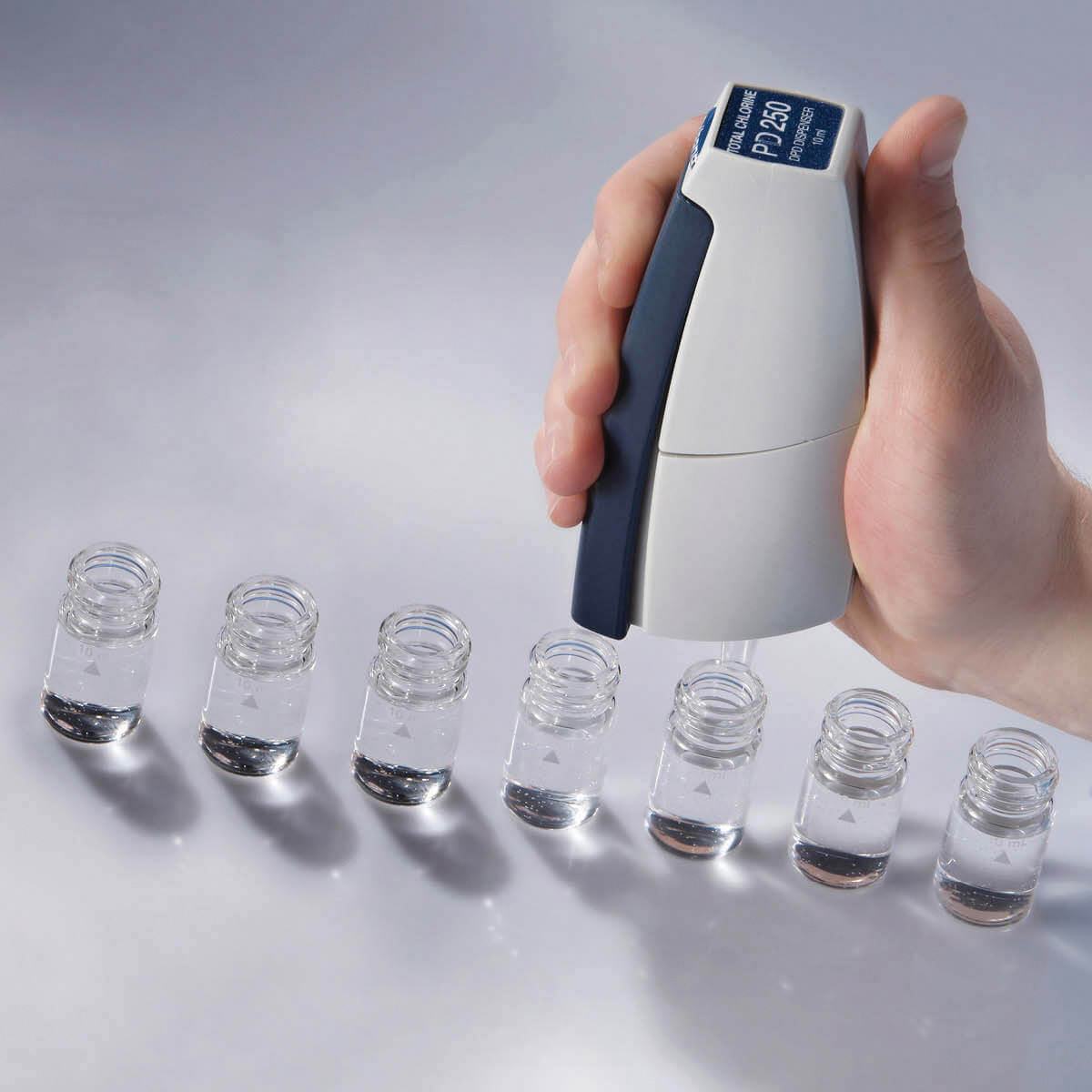 The PD250 is designed for easy and controlled dosage of DPD powder reagents. One click gives the exact amount of reagent required for a 10 ml sample. The PD 250 is the perfect alternative to the powder packs for those carrying out a number of tests, saving time while also reducing the amount of packaging waste. The reagent is supplied in sealed glass vials, sufficient for up to 250 tests. The protective sealing enables a shelf life of up to 5 years although, once the vial has been opened, the contents should be used within 6 months. The vials can be changed quickly and easily. Furthermore, the dispenser can be thoroughly cleaned and the ergonomic design allows for comfort during operation.
