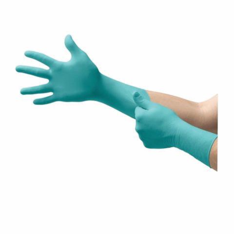 Exam Gloves, XL, 12" L, Green, Nitrile, 0.1 mm Cuff Thickness, 0.15 mm Palm Thickness, 0.18 mm Finger Thickness, Extended Length, Beaded Cuff Style, Ambidextrous Shape, Powder-free Glove Interior, Disposable, Non-sterile