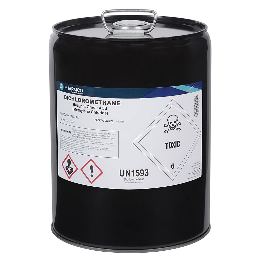 Dichloromethane, 5 gal, ACS Grade, CAS Number 75-09-2, CH2Cl2 Chemical Formula, 84.93 g/mol Molecular Weight, Colorless, Liquid, -142°F Melting Point, 104°F Boiling Point, 1.325 g/ml Density