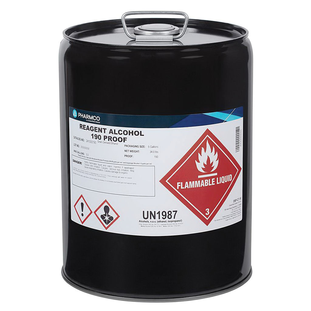 Denatured 3A Reagent Alcohol, 5 gal, 190 Proof Concentration, 95% Assay, ACS Grade, Colorless, Liquid, -202°F Melting Point, 173°F Boiling Point, 62°F Flash Point, 0.785 g/ml Density