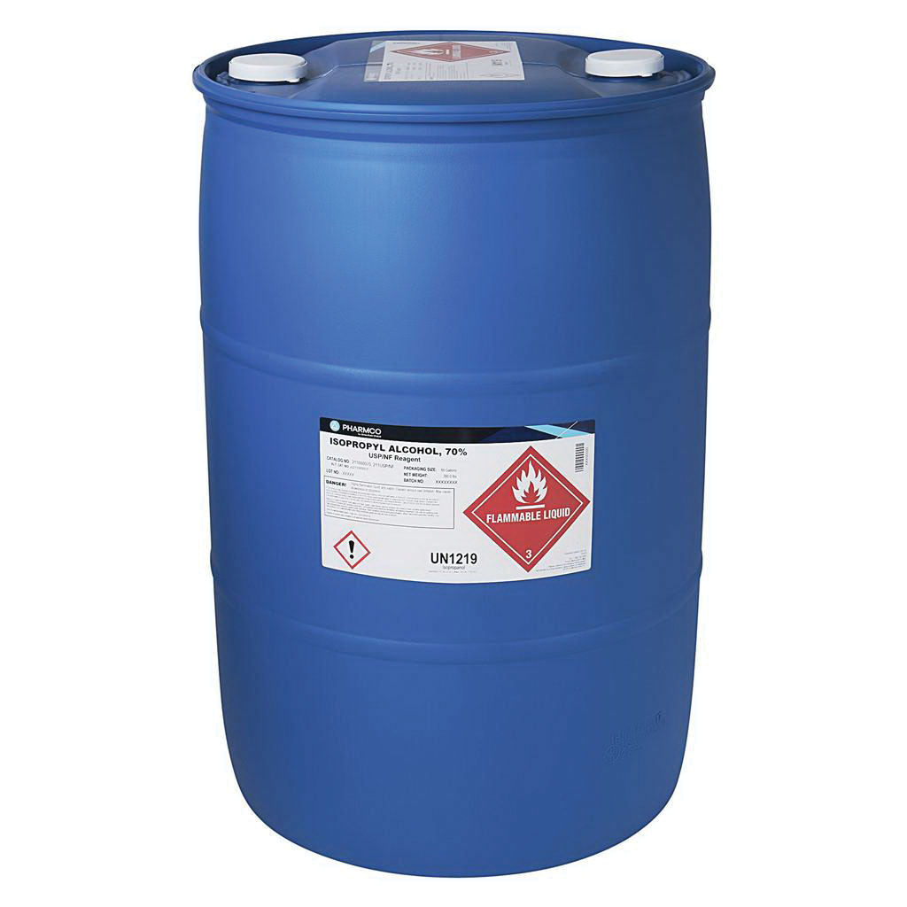 Isopropyl Alcohol, 55 gal, 70% Assay, USP/NF Grade, Colorless, Clear, Liquid, -130 to -128.2°F Melting Point, 181.4°F Boiling Point, 53.6 to 69.1°F Flash Point
