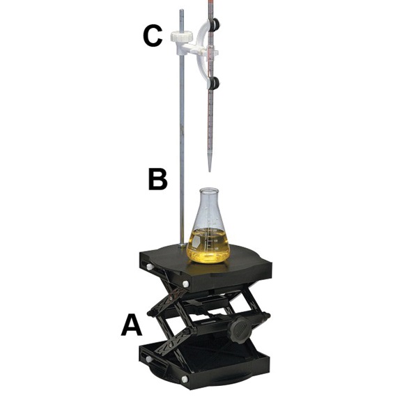 Supports gradient makers, hot plates, flasks, beakers, baths and other lab items up to 6.8 kg. Molded of strong polycarbonate and assembled with no metal parts, the plastic jack is electrically non-conductive, can be immersed in a bath or used in corrosive environments and is steam autoclavable at 121°C.