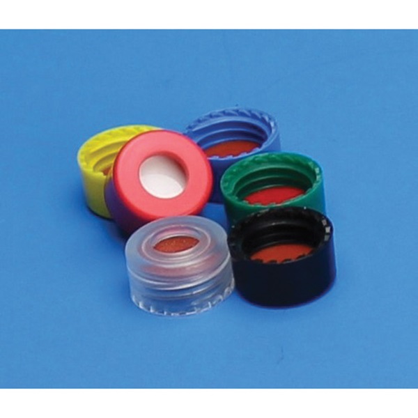 Closure, 9 mm, Natural, Polypropylene, PTFE/Butyl Rubber Septa, Ribbed, Screw Thread, Open Top Type, For 12 x 32 mm R.A.M.™ Large Opening Vials, Designed to Work in Agilent or Other Robotic Arm Autosamplers