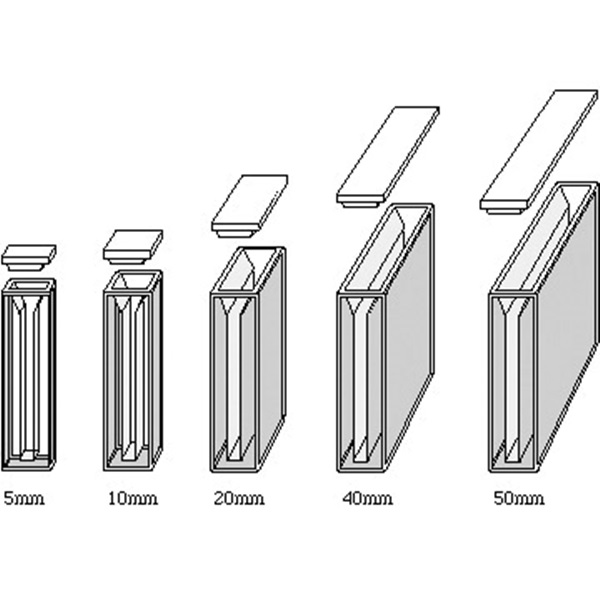The purpose of semi-micro type 9 cells is to reduce the sample volume necessary to make a measurement. The volume of a semi-micro cell is approximately 40% of an equivalent path length standard rectangular cell. Semi-micro cells are available with either clear walls parallel to the light beam or non transmitting self masking black walls which improve sensitivity by eliminating stray light from measurements. The interior sample compartment width of semi-micro cells is reduced to 4 mm, therefore it is essential to determine that the light beam from the instrument passes centrally through the sample compartment. This is especially important for long path length cells. Both the type 9 and type 9B are supplied with a PTFE cover (not pictured with the type 9B or 9B9). Smaller sample volumes can be achieved by using cell type 9/9 or 9B9 with a 9 mm instead of a 3 mm thick base. Note: Cells with a 9 mm base are not suitable for an instrument with an 8.5 mm 'Z' dimension.