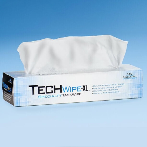 TechWipe® is a specialty task wipe for use on optical glass and lenses. Intended for light duty cleaning of sensitive glass surfaces, these virtually lint free wipes are inter-folded and conveniently boxed for always-clean, one-at-a-time dispensing. With a built-in poly-film dust layer to wipe away dirt and smudges, TechWipes® easily handle the delicate task of cleaning lenses, test tubes, electronics, computer screens, tablets and more.