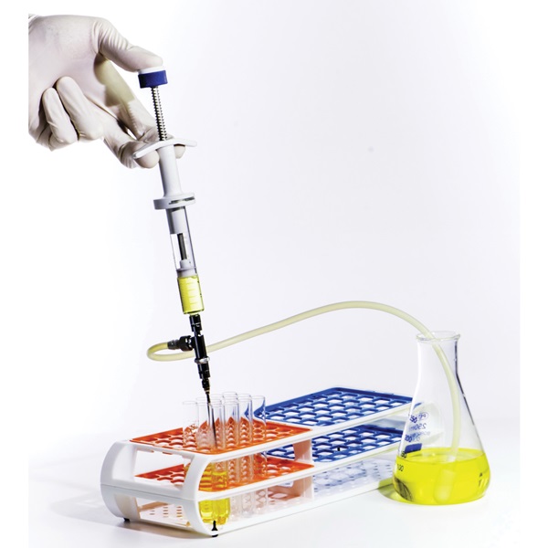 Minipet™ Pipettors feature a three-way check valve for continuous, repetitive pipetting. Just place the filling line in a reservoir, push the PTFE plunger to dispense and release to refill.