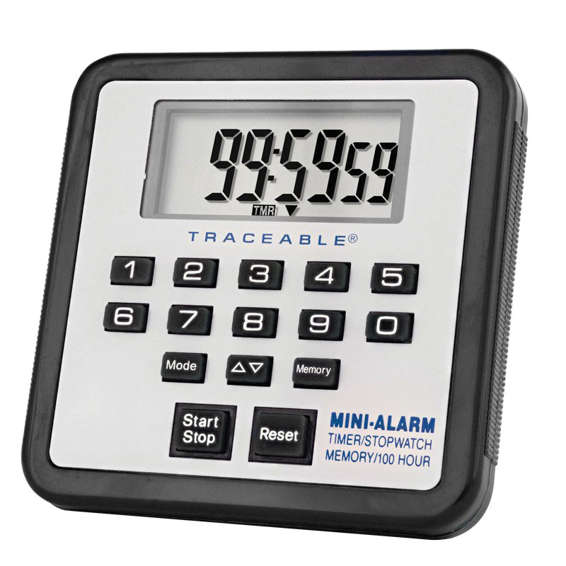 Counts down with an alarm and may be set to count up and alarm. With included memory feature, set it once, press recall, and start counting down from the memory time. In the stopwatch mode it counts up from 1 second to 99 hr, 59 min, 59 sec. Extra-large, 0.375" high LCD digits are readable from 8'. Accuracy is 0.01% and shows time of day. In the alarm mode it may be programmed to count down or up and alarm at any time from 1 sec to 99 hr, 59 min, 59 sec. The display shows the time remaining to alarm or elapsed time since alarming. Individually numbered keys make setting time and alarm fast and easy. Extra-loud, high-decibel alarm is automatically silenced after 1 min or may be turned off manually. Time is up message is displayed when set time is reached. Unique thru-zero feature shows time elapsed since the alarm has sounded.