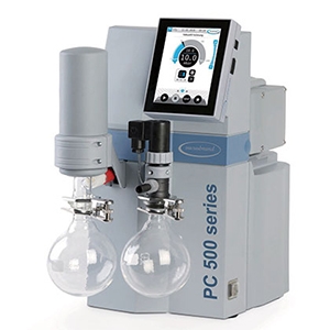 These pumps are excellent choices for supporting controlled evaporation or drying processes. The PC 510 select, with the MZ 2C NT two stage chemistry diaphragm pump (7 mbar/1.4 cfm) can be used for many common solvents, while the PC 610 select, with the MD 4C NT three stage chemistry diaphragm pump (1.5 mbar/2.2 cfm) meets the higher vacuum requirements for most high boiling point solvents.
