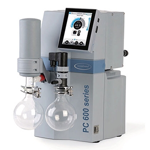 These pumps are excellent choices for supporting controlled evaporation or drying processes. The PC 510 select, with the MZ 2C NT two stage chemistry diaphragm pump (7 mbar/1.4 cfm) can be used for many common solvents, while the PC 610 select, with the MD 4C NT three stage chemistry diaphragm pump (1.5 mbar/2.2 cfm) meets the higher vacuum requirements for most high boiling point solvents.