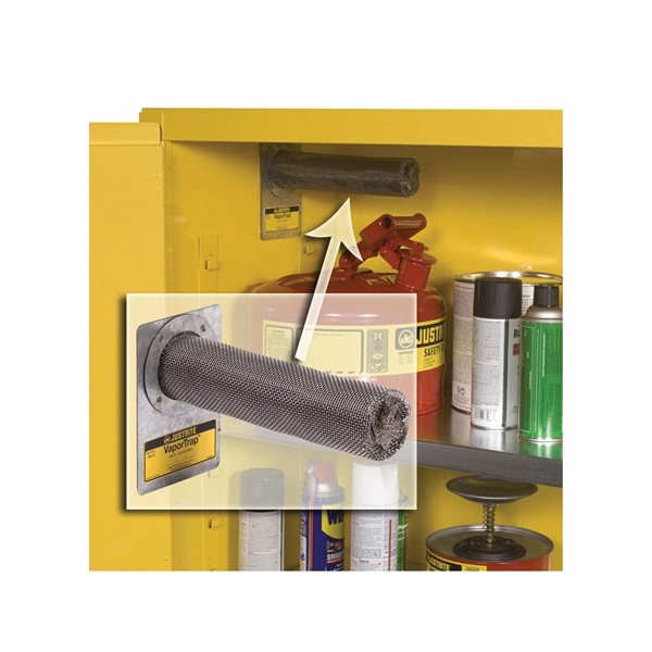 Install a VaporTrap™ Filter to reduce harmful VOC vapors inside your safety cabinets. Activated carbon filter medium contained in a stainless steel mesh cartridge adsorbs the volatile organic chemical vapors from cabinets storing flammable liquids. Sturdy 4 x 5.5" (102 x 139 mm) magnetized base offers flexible placement anywhere within the cabinet. Date notation area on label serves as a reminder for replacement; life cycle varies based upon vapor types and concentrations. Due to variables such as the chemical itself, its purity or its vapor pressure, temperature, humidity, charcoal age, etc., it is difficult to estimate VOC vapor absorption rates. The Justrite VaporTrap™ Carbon Filter is not intended to be used as a substitute for using safe closed containers as required by OSHA and the EPA. It is important to clean up spills and residues from the cabinet and containers.