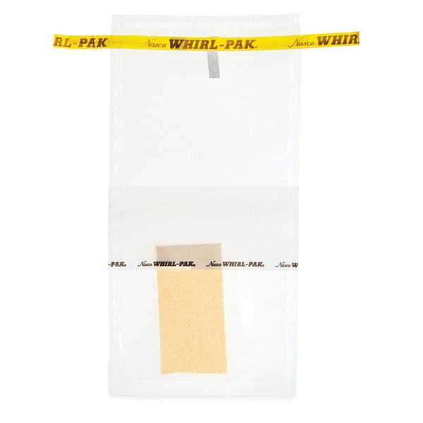 The Whirl-Pak® Speci-Sponge® bag is designed for environmental surface sampling of work areas, equipment, animal carcasses, and any other place where testing for Listeria, Salmonella, E.coli, coliforms, and other foodborne pathogens, or anthrax is required. The special dry sponge is free of bactericides and has been tested to be non-inhibitory. It measures approximately 1.5" x 3" x 0.625" (3.8 x 7.6 x 1.5 cm) thick when wet, and is sterilized inside a Whirl-Pak® bag. Wearing a sterile glove when wiping with the sponge is recommended to help prevent contamination. After the sample has been collected and the sponge returned to the bag, it can be sent to a lab for testing. In the lab, media may be added directly to the bag and the sample incubated inside the bag for a +/- test, or the sample may be squeezed out of the sponge, pipetted, and plated out.