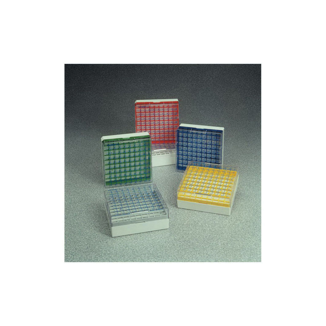 Cryobox, 133 L x 133 W x 52 mm H, White, Polycarbonate, 100 (1 to 1.5 ml Vials) Capacity, Keyed Lids, Prevent Misalignment, Durable, For Short-or Long-term Storage, Autoclavable, Printed Grid, Break-resistant