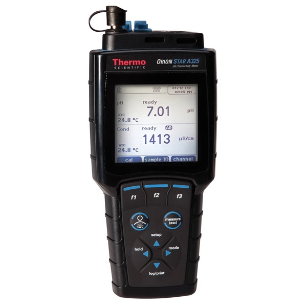 A325 Multiparameter Meter Kit, 9.5 L x 3.9 W x 2.6" H, 5 to 45°C Operating Temperature, IP-67 Rating, Four AA Battery, Universal 50 to 60 Hz & 100 to 240 VAC Power Adapter, ±0.1°C Temperature Accuracy, 1 to 5 pH Calibration Points