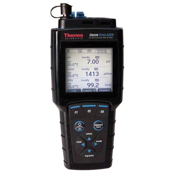 A329 Portable Multiparameter Meter Kit, 9.5 L x 3.9 W x 2.6" H, 5 to 45°C Operating Temperature, IP-67 Rating, Four AA Battery, Universal 50 to 60 Hz & 100 to 240 VAC Power Adapter, ±0.1°C Temperature Accuracy, 1 to 5 pH Calibration Points