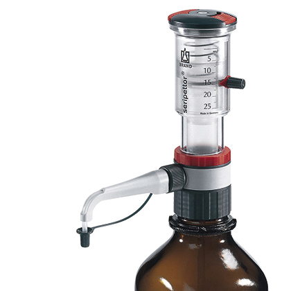 Bottletop Dispenser, 0.2 to 2 ml, Polyethylene, Polypropylene and EPDM Fluid Path, 0.04 ml Subdivision, =±1.2% Accuracy, =0.2% Imprecision (CV%), Up to 2.2 g/cm3 Density, 15 to 40°C Operating Temperature, Up to 500 mbar Pressure